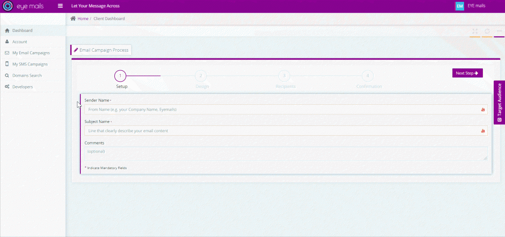 - Add sender (ex. EYEmails), subject, comments (optional) and sender email (for clients using imails services)